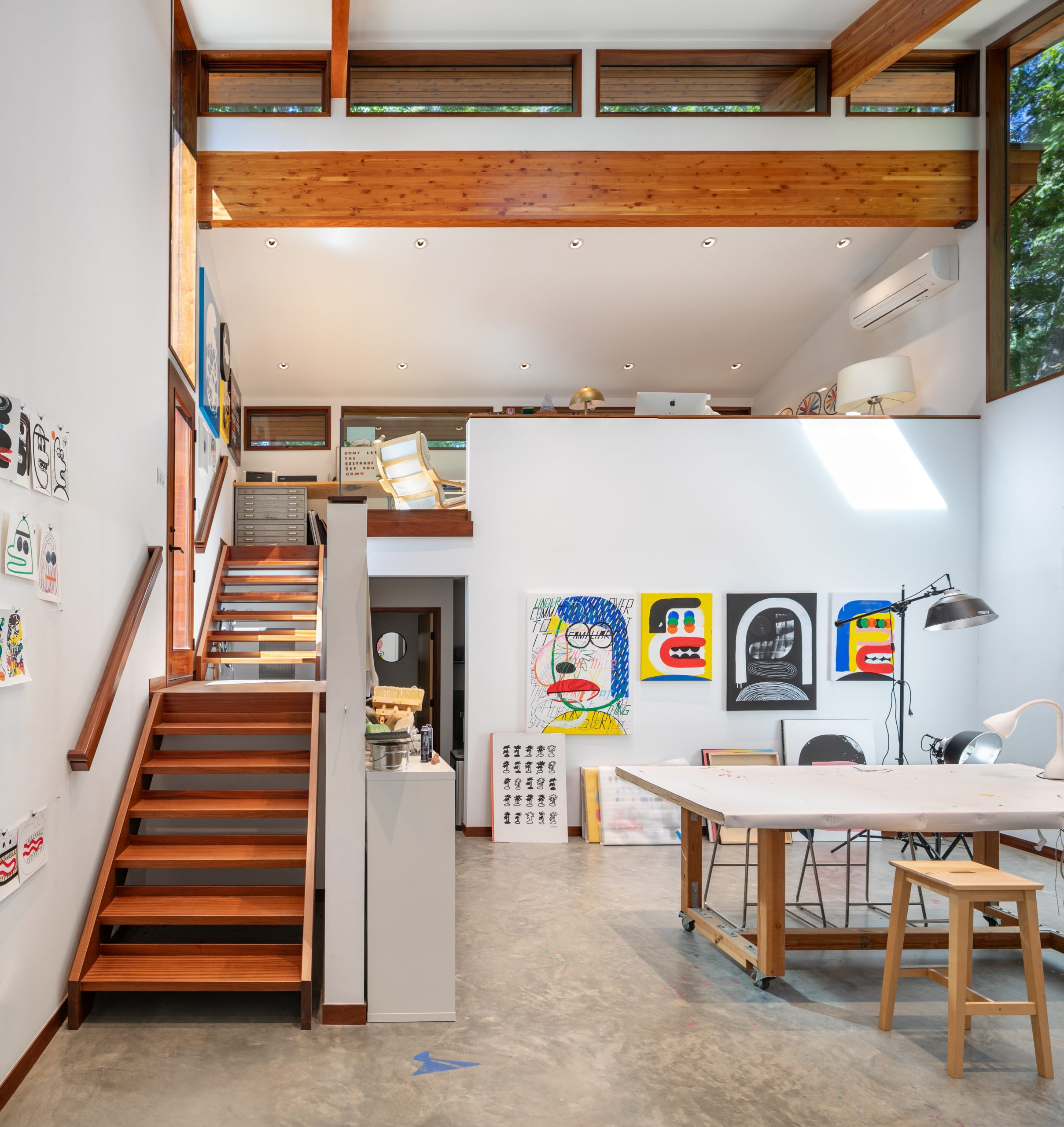 They wanted to maximize wall space with high ceilings, long walls, and an upper mezzanine. Their hope was to have indirect sunlight for most of the space to avoid shadows while working with natural light reflection. The couple wished to incorporate a swinging garage door, a utility sink for washing paint supplies, a bathroom with a small upright shower to spray out screenprints, and a side entry door adjacent to their existing garage. They also needed a 150 square foot spray room confined from the rest of the studio, with proper ventilation to accommodate larger works.