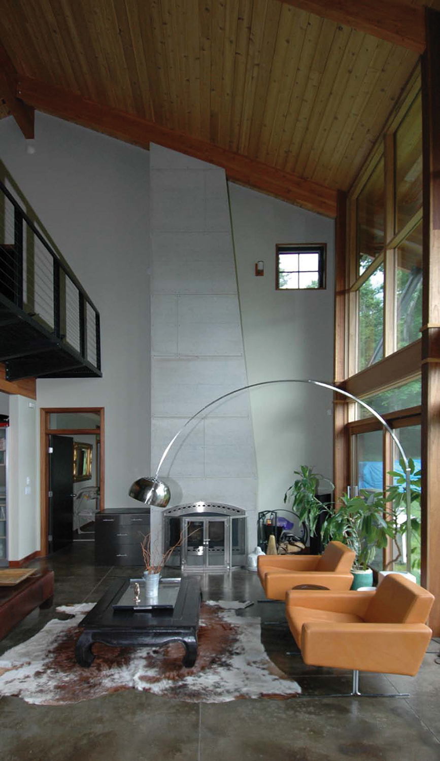 The Aspen, an industrial take on a traditional New England farmhouse, is an Acorn Deck House Company collaboration with Ritch Holben of RHDesign in Southfield, MA. It is sited in an extremely cold climate, perched atop the Berkshire Mountains, and designed with sustainability in mind. The home is oriented towards the South to maximize sun exposure in the wintertime, but also features large overhangs to shade the home when the sun is higher in the summer. The exterior siding is stained dark and the floors are concrete to absorb even more heat during the colder months.
