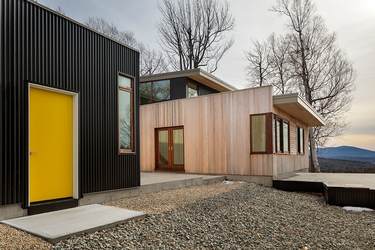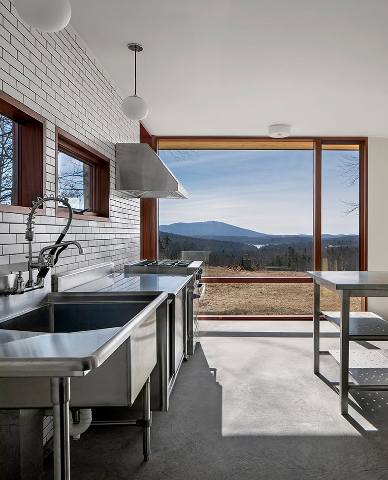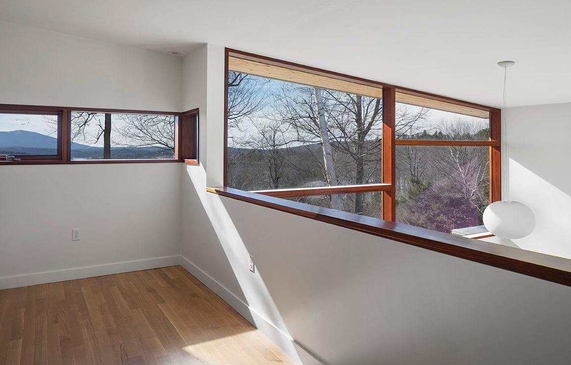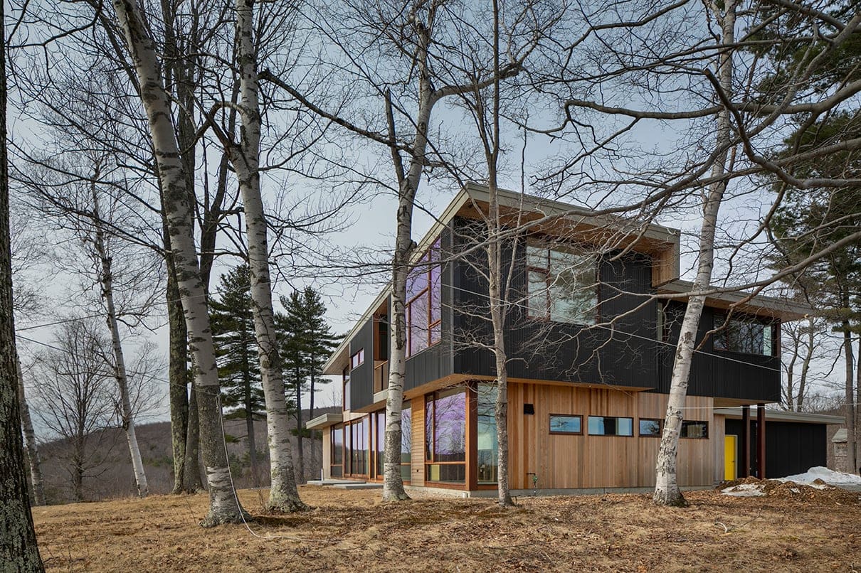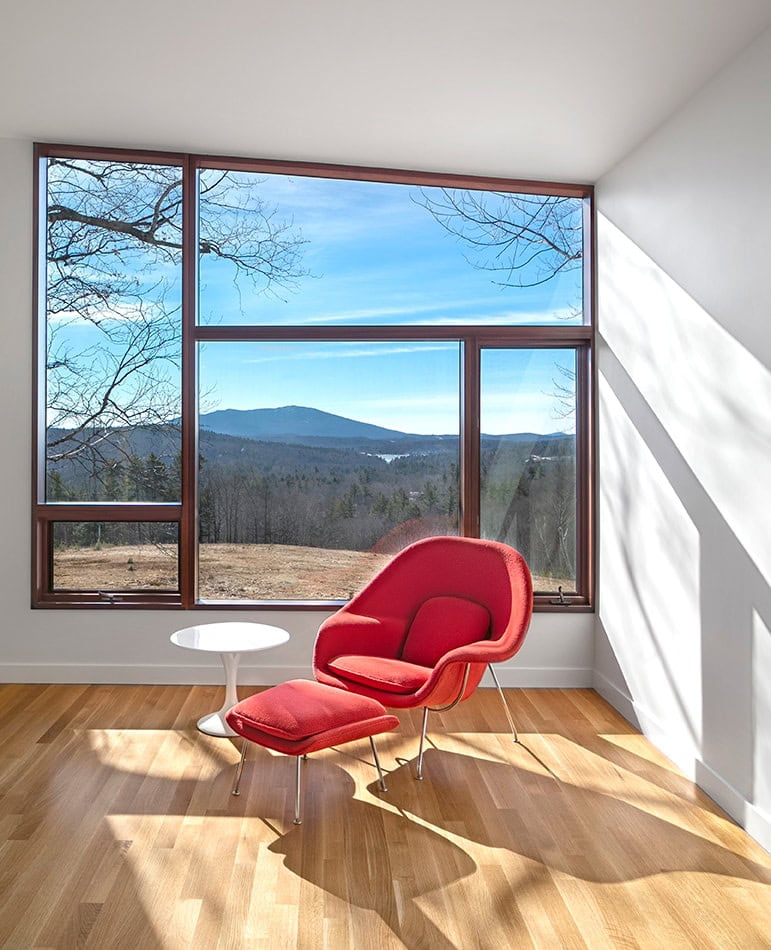 Monadnock Retreat is striking nestled amongst the mountains of New Hampshire. It features an expansive open floor plan and floor-to-ceiling walls of glass to capture the views. This home has three bedrooms and two-and-a-half baths, including a master bath with an open-air shower and balcony.