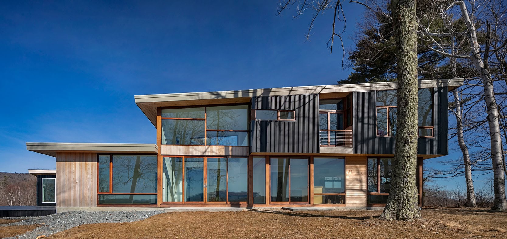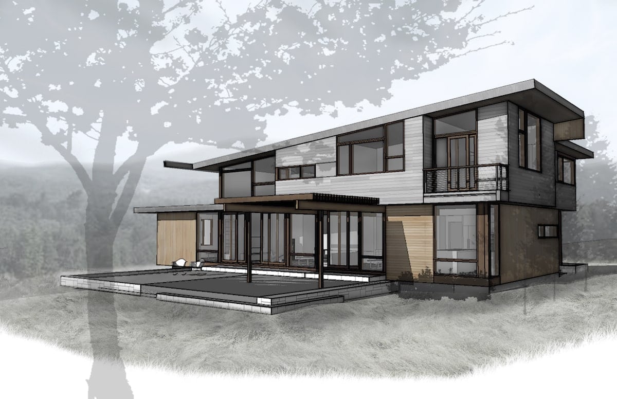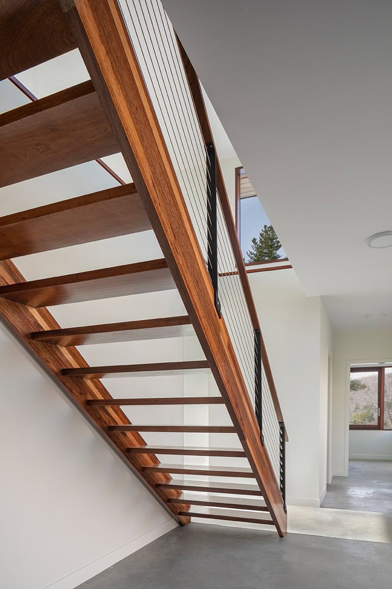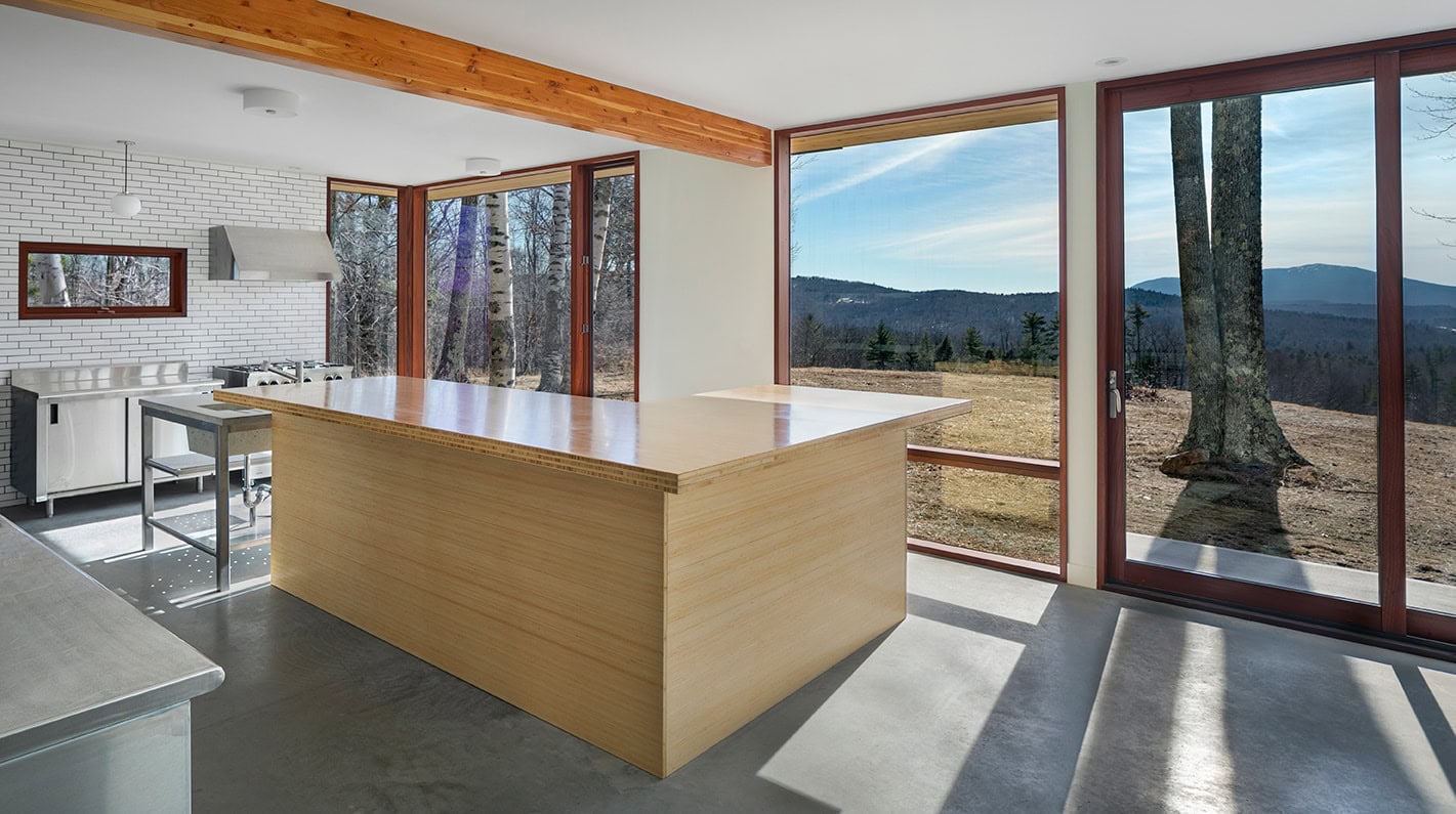 Monadnock Retreat is striking nestled amongst the mountains of New Hampshire. It features an expansive open floor plan and floor-to-ceiling walls of glass to capture the views. This home has three bedrooms and two-and-a-half baths, including a master bath with an open-air shower and balcony.
