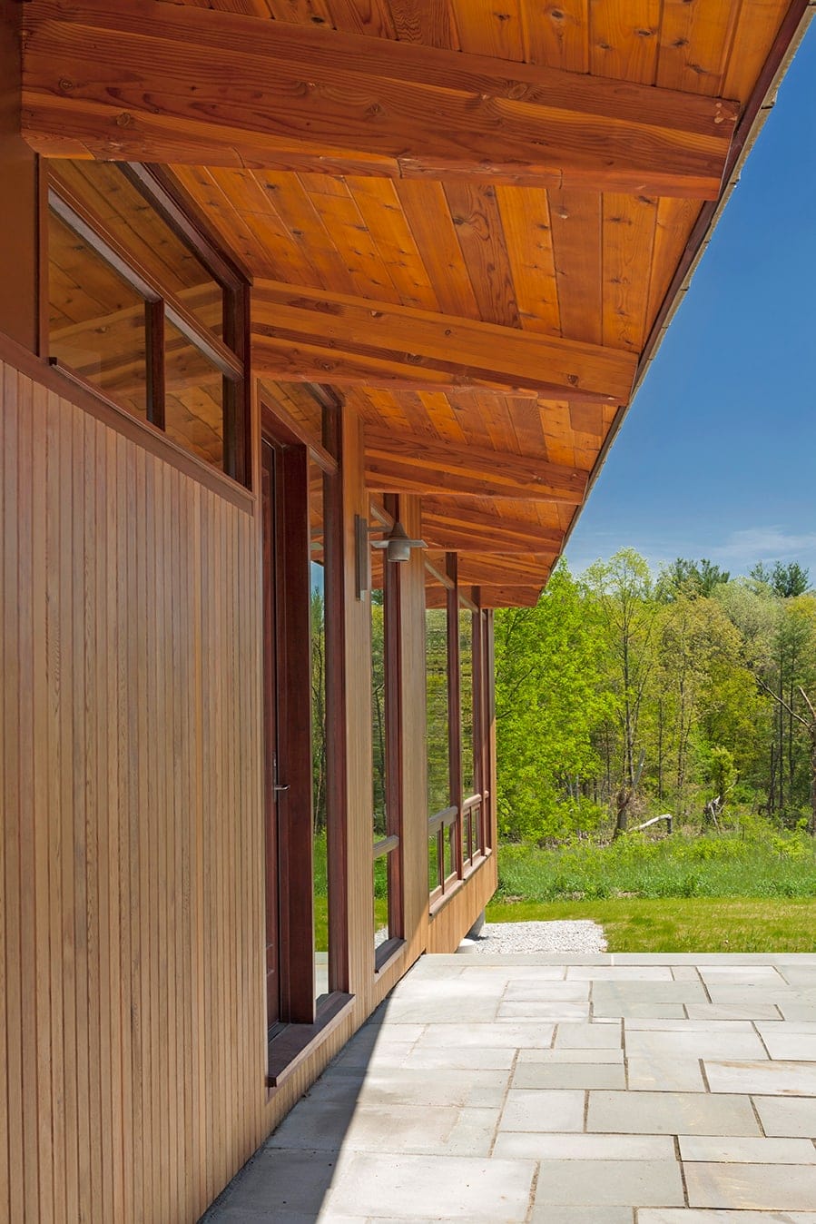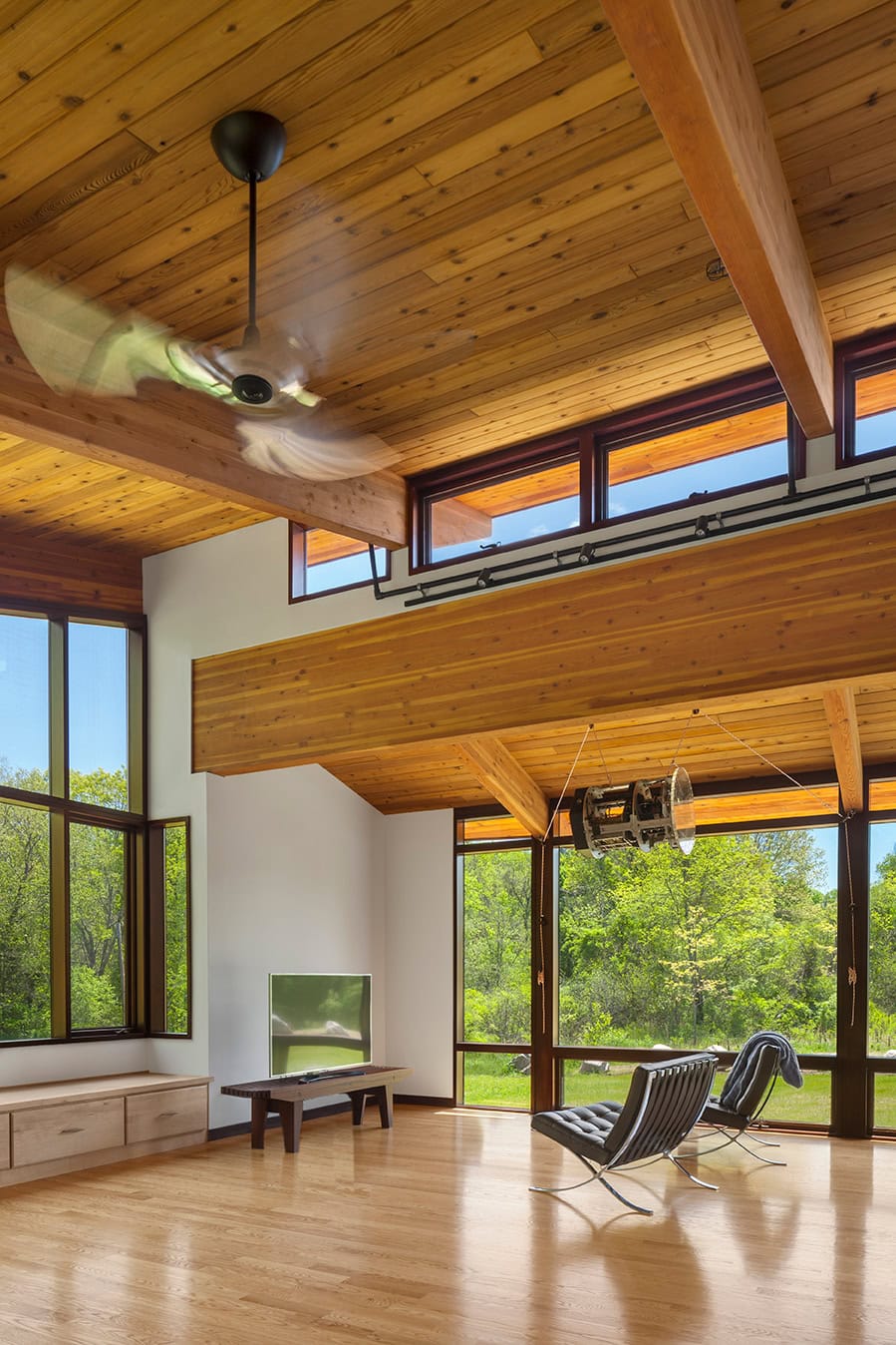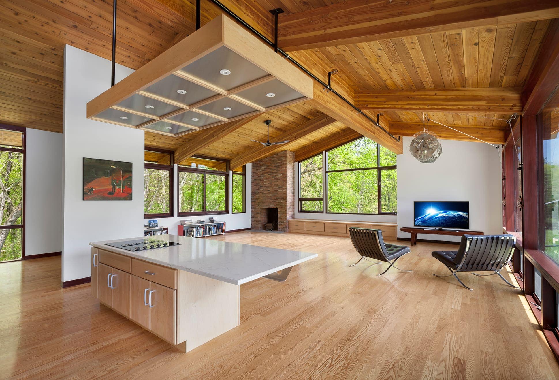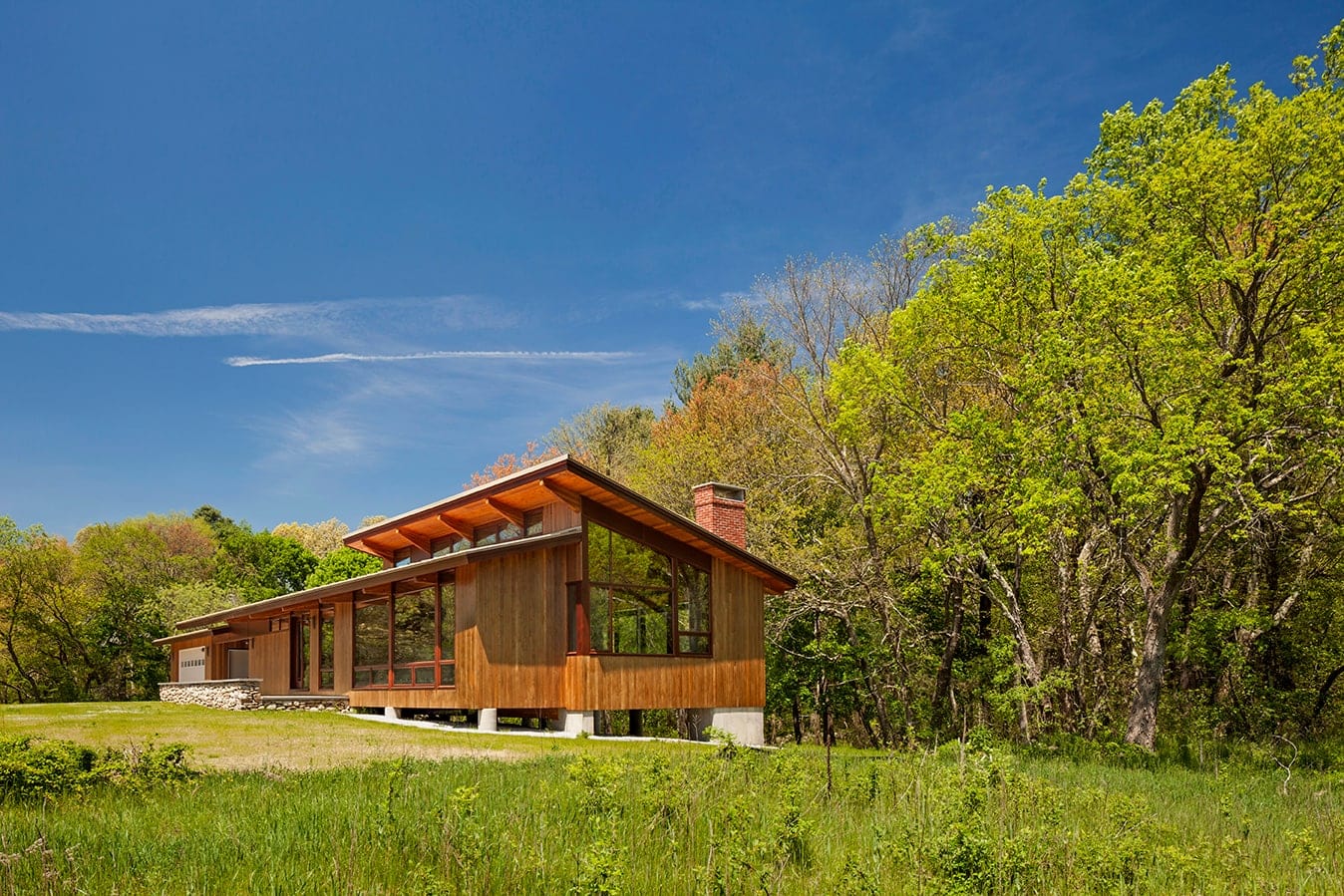 The River View Residence is a stunning one-level Deck House located in the mid-century modern haven of Carlisle, Massachusetts. This 2-bedroom, 2-bathroom design draws inspiration from the original Deck House models of the ‘60s, but utilizes modern day features such as a metal roof and geothermal heating. This home also features a 2-car garage, carport and a large great room that is perfect for entertaining.